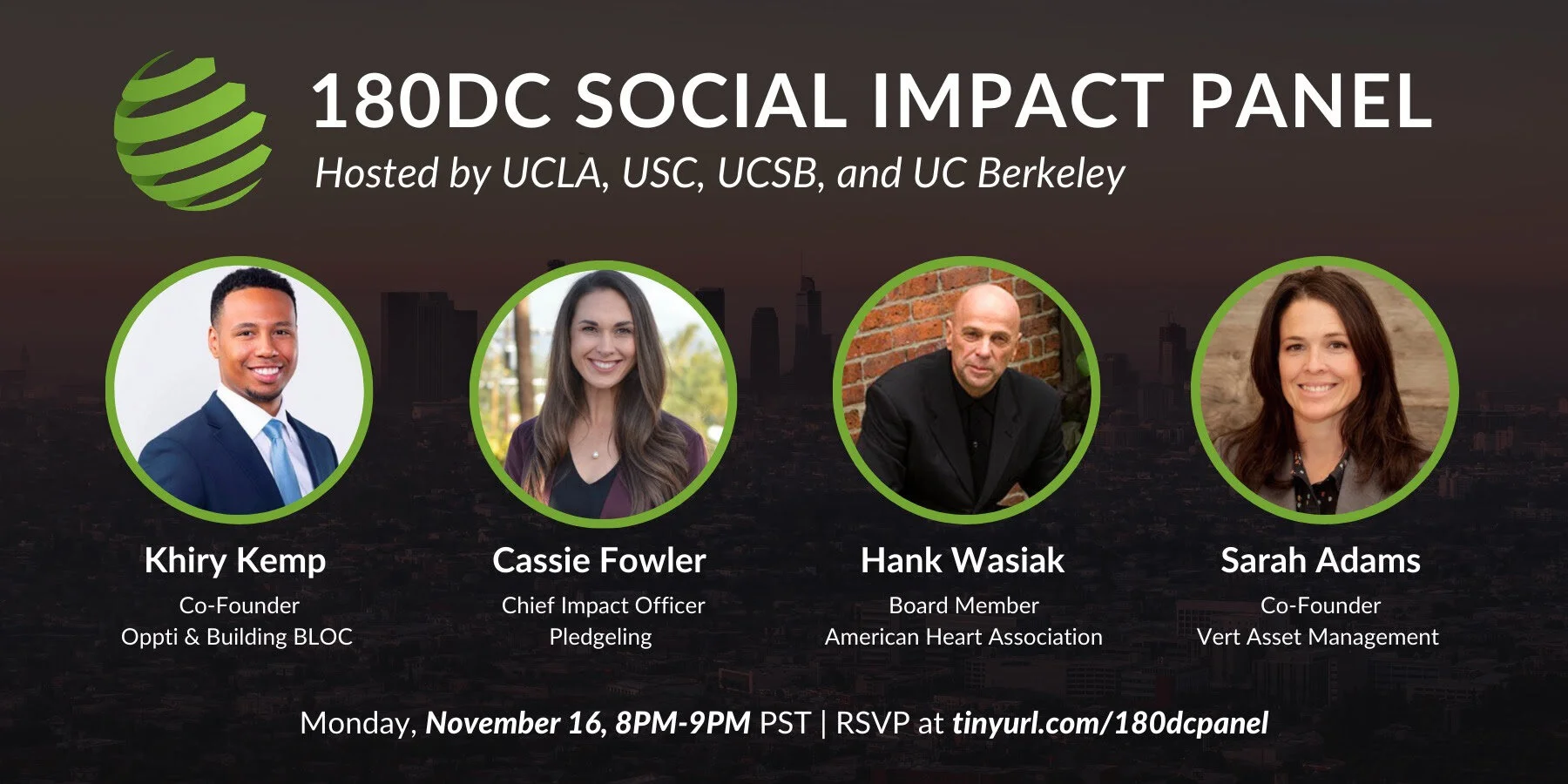 The UCLA, UC Berkeley, USC, and UCSB chapters of 180 Degrees Consulting (180DC) are excited to host their virtual Social Impact Panel on November 16 from 8-9PM PST! Hear from a panel of professionals doing exciting and meaningful work in industries ranging from finance to education to technology and explore career paths where you can make positive social impact and change! The moderated panel will be followed by a Q&A with their speakers.