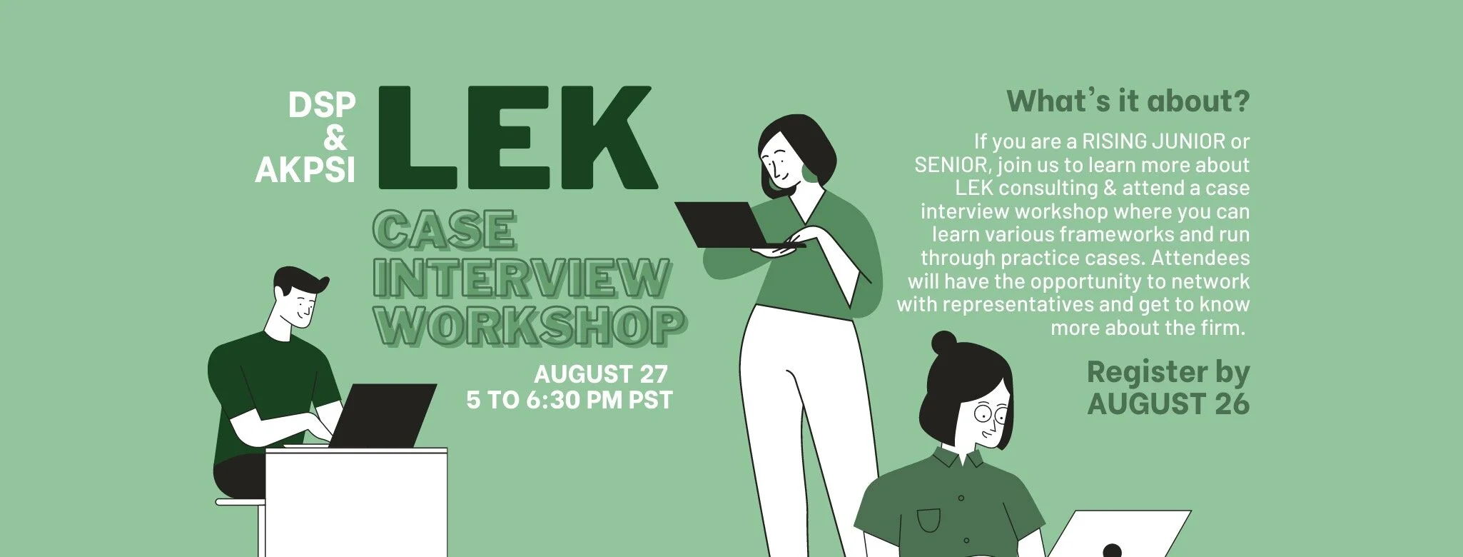 They invite you to join them for a Case Interview Workshop. There will be a short introduction that will enable you to learn more about L.E.K., and then a case interview workshop where you will learn various frameworks and run through some practice cases. There will also be time to speak with representatives from the firm, which will be a great opportunity to learn more.